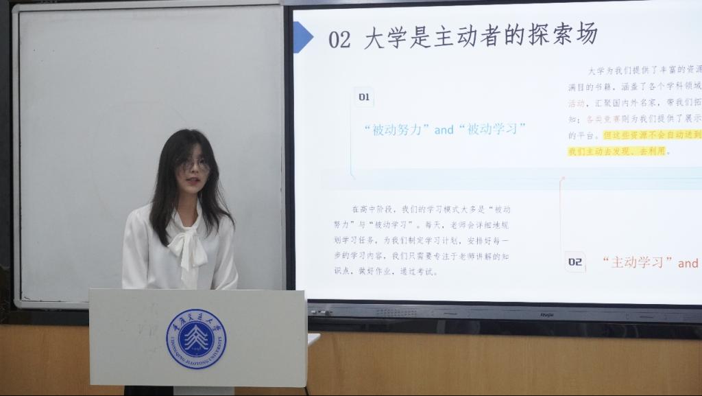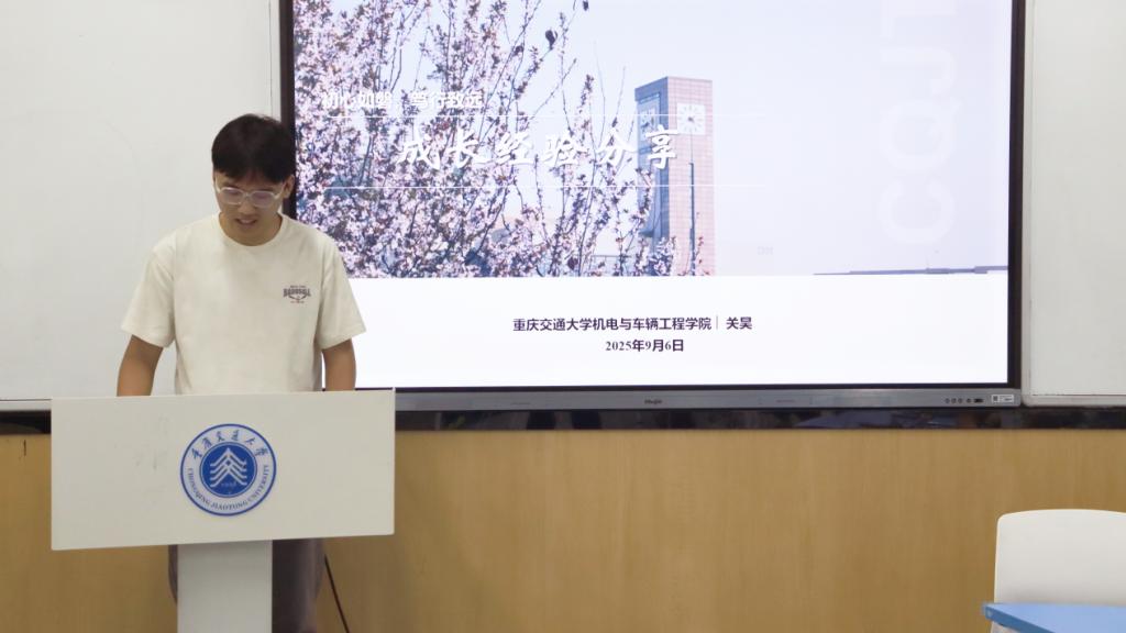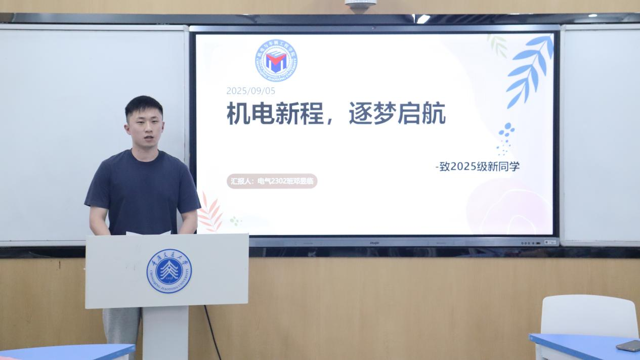 优秀学子代表管冰冰、邓昱临、和关昊分别分享了他们的学习经验和成长故事。他们围绕“四问三比”,就如何坚定机电报国信念、高效学习方法、攻克专业核心课、参与科研项目及学科竞赛等方面进行了深入交流。通过展示参与的具体项目成果图片,他们生动展现了机电学子的创新能力和实践精神,为新生们树立了学习的榜样。