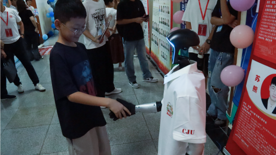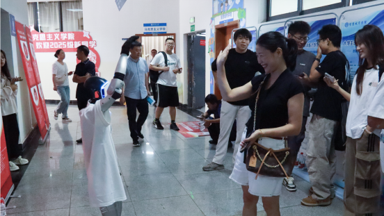 在迎新科技展示区域里,一只轮足式小狗灵活地跑来跑去,人形机器人G1也能精准地按照指令行动——新生们只需发出语音指令,就能和机器人展开实时互动。在这一过程中,大家能亲身领略机械结构设计与智能算法相互配合、共同运作的奇妙,真切触摸到“机电力量”所蕴含的科技精髓,让科技创新的种子在心底悄然种下。除此之外,学院还精心布置了学科竞赛展板和升学光荣榜,上面全面呈现了2024 - 2025学年学生们斩获的国家级竞赛奖项,以及2025届毕业生的优异升学成果,以此为新生树立起学习的标杆。