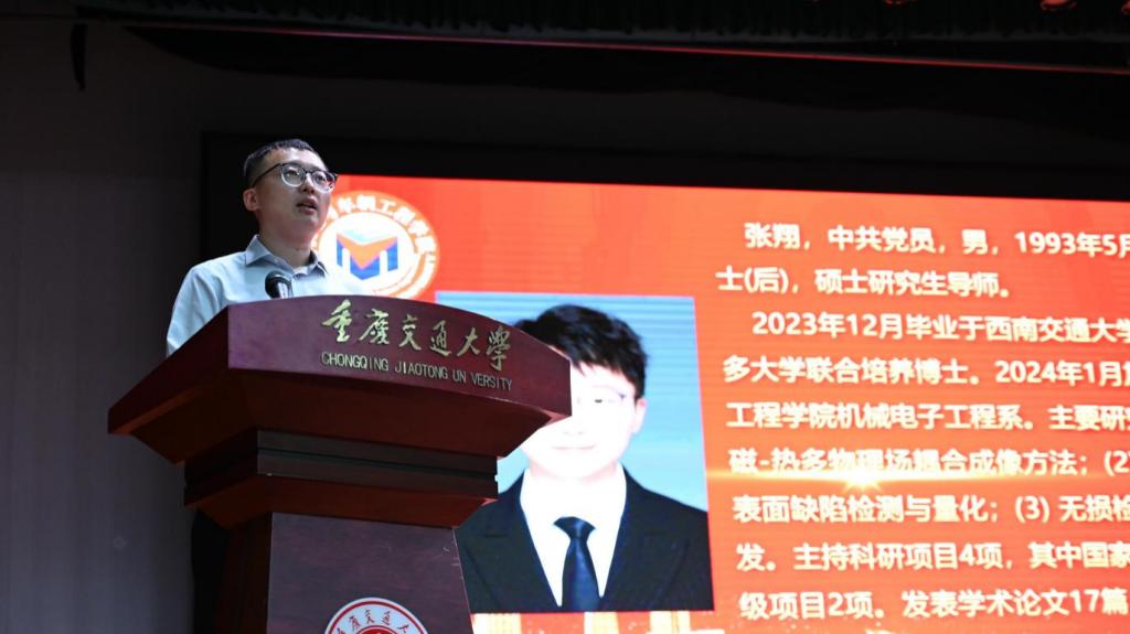 学院教师代表、机械电子工程系张翔博士发言。他以“机电学院是一个‘点亮梦想’的地方”开篇,生动描绘了从机械设计铸就重器、车辆工程驱动智慧出行,到电气工程点亮电网、智能制造探索数智融合的各专业宏伟图景。他寄语新生秉承“明德行远,交通天下”的校训精神,以“明德”为基石塑造品格,以“行远”为使命求实创新,以“交通天下”为理想担当使命,鼓励大家既要脚踏实地钻研专业,也要仰望星空追逐梦想。